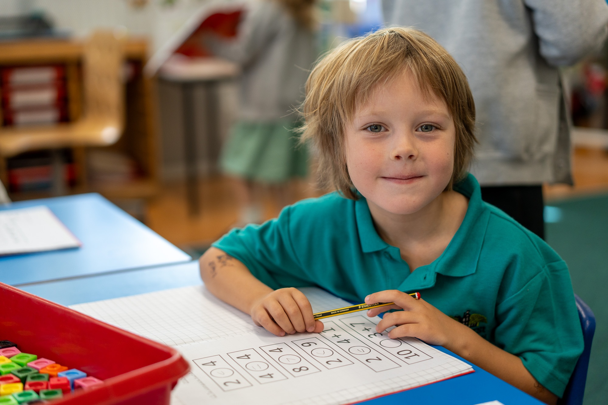 Through practical activities children explore and discuss the operations. We encourage children to talk in full sentences and use mathematical language. It is only by the end of Year 2 that they start to use the formal written methods of calculation.